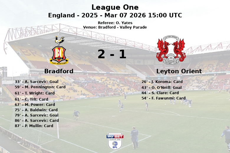 A partida começou em ritmo frenético. Aos 33 minutos, o Bradford abriu o placar com um gol de A. Sarcevic, assistido por J. Neufville. No entanto, a alegria durou pouco, já que O. O’Neill empatou para o Leyton Orient aos 43 minutos.