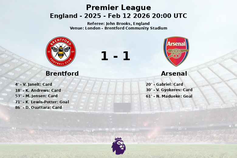 O Arsenal dominou a posse de bola com 60%, mas não conseguiu traduzir isso em vantagem no placar. No entanto, N. Madueke abriu o placar para os Gunners aos 61 minutos, com assistência de P. Hincapie. A alegria, porém, durou pouco para os visitantes, já que K. Lewis-Potter igualou para o Brentford aos 71 minutos, assistido por S. van den Berg.