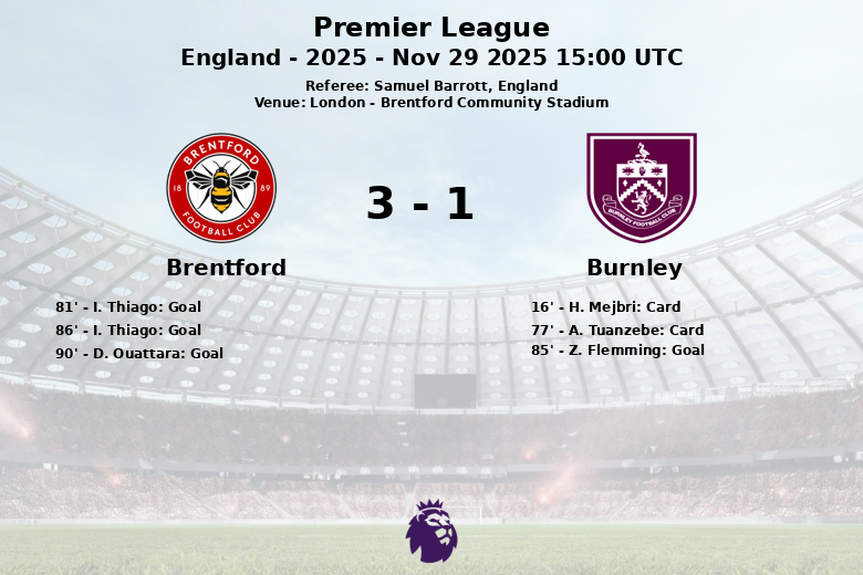 O Brentford garantiu uma vitória suada sobre o Burnley com um placar final de 3 a 1 em uma partida disputada no Brentford Community Stadium. O confronto da Premier League, correspondente à 13ª rodada, foi caracterizado por intensidade e emoção, especialmente nos minutos finais.