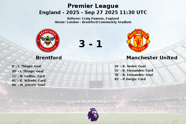 A partida começou com uma atuação arrasadora do Brentford. I. Thiago abriu o placar aos 8 minutos, assistido por J. Henderson, e ampliou a vantagem aos 20 minutos com seu segundo gol da tarde. No entanto, o Manchester United reagiu, e B. Sesko diminuiu o placar aos 26 minutos.