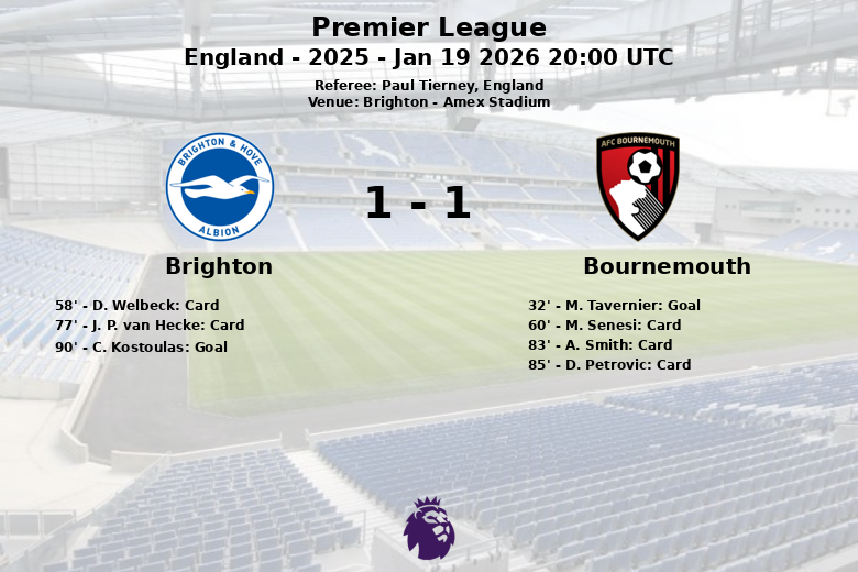 Quando tudo parecia indicar uma vitória visitante, C. Kostoulas empatou o jogo aos 90 minutos para o Brighton, com assistência de J. P. van Hecke, gerando euforia nas arquibancadas do Amex Stadium. A partida terminou empatada, refletindo a intensidade e a luta demonstrada por ambas as equipes. O Brighton gerou 17 chutes, com 5 no alvo, enquanto o Bournemouth teve 12 chutes, com apenas 2 no alvo.
