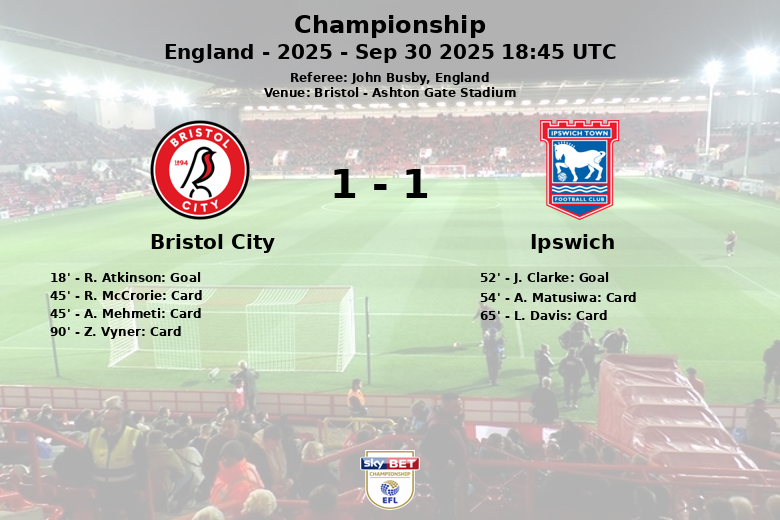 Bristol, Inglaterra – Uma partida disputada e repleta de cartões ocorreu no Ashton Gate Stadium, onde Bristol City e Ipswich Town empataram em um jogo válido pela oitava rodada do Championship. O Bristol City abriu o placar aos 18 minutos com um gol de R. Atkinson, assistido por A. Mehmeti, gerando alegria nas arquibancadas.