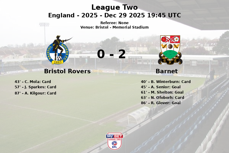 Bristol, Inglaterra – Em um jogo disputado no Memorial Stadium, correspondente à 23ª rodada da League Two, o Barnet garantiu a vitória contra o Bristol Rovers. Apesar do Bristol Rovers dominar a posse de bola com 57%, eles não conseguiram traduzir sua superioridade em gols. O Barnet, com 43% de posse, foi mais eficaz em suas chegadas à área adversária.