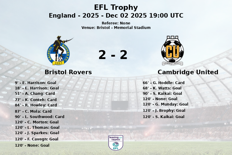A partida, válida pela fase de 32 avos de final do EFL Trophy 2025, viu o Bristol Rovers assumir a liderança logo cedo. E. Harrison se destacou como um jogador chave, marcando um pênalti aos 9 minutos, seguido por outro gol aos 18 minutos com assistência de L. Thomas. O primeiro tempo mostrou um Bristol Rovers sólido, capitalizando suas chances.