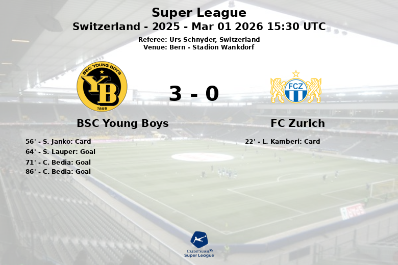 Berna, Suíça – O BSC Young Boys derrotou o FC Zurich de forma convincente no Stadion Wankdorf, em uma partida dominada pela posse de bola e superioridade ofensiva da equipe da casa. A partida, correspondente à 27ª rodada da Super League, terminou com um placar que refletiu a disparidade no jogo.