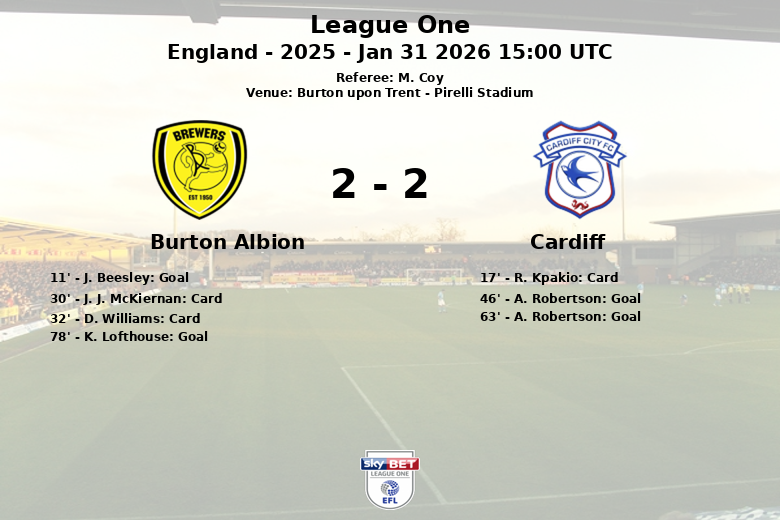 Burton upon Trent testemunhou um encontro vibrante no Pirelli Stadium, onde Burton Albion e Cardiff City empataram em uma partida cheia de reviravoltas. Os “Brewers” assumiram a liderança cedo graças a um gol de J. Beesley aos 11 minutos, com uma jogada individual. A partida foi caracterizada por alta intensidade, refletida nos cartões amarelos de R. Kpakio pelo Cardiff e J.J. McKiernan e D. Williams pelo Burton Albion, durante o primeiro tempo.