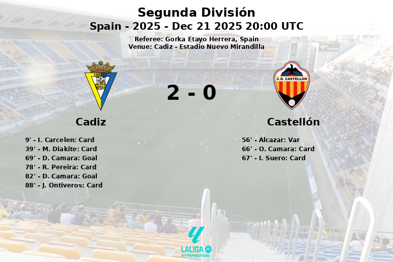 Cádiz, 21 de dezembro de 2025 – O Cádiz garantiu uma vitória em casa contra o Castellón em uma partida da 19ª rodada da Segunda División, disputada no Estádio Nuevo Mirandilla. Apesar de ter apenas 34% da posse de bola, o Cádiz mostrou-se eficaz na frente do gol, marcando dois gols decisivos, ambos de D. Camara, com assistências de A. Pascual aos 69 e 82 minutos.