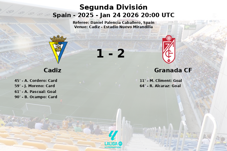 Apesar da insistência final do Cádiz, o marcador não se moveu mais. A equipa da casa dominou a posse de bola com 61%, gerando 17 remates, embora apenas 5 tenham sido à baliza, e conseguiu 8 cantos. Por sua vez, o Granada CF, com 39% de posse de bola, realizou 12 remates, dos quais 2 foram à baliza, e obteve 2 cantos. O árbitro, Daniel Palencia Caballero, teve trabalho para controlar o encontro, assinalando um total de 26 faltas e mostrando três cartões amarelos e um vermelho.
