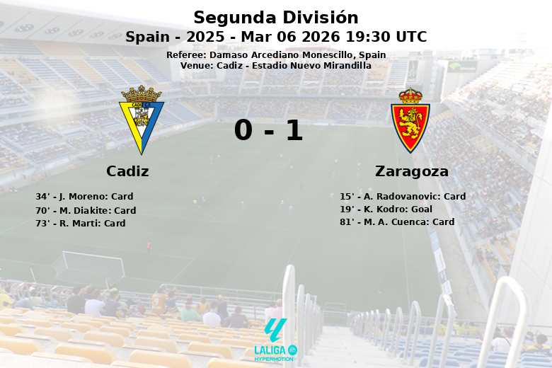 Cádiz, Espanha – Num encontro disputado no Estádio Nuevo Mirandilla, o Zaragoza conquistou a vitória contra o Cádiz, num jogo marcado pela intensidade e luta no meio-campo. O solitário golo de K. Kodro, aos 19 minutos, após uma jogada que desequilibrou a defesa do Cádiz, foi suficiente para garantir o triunfo da equipa aragonesa.