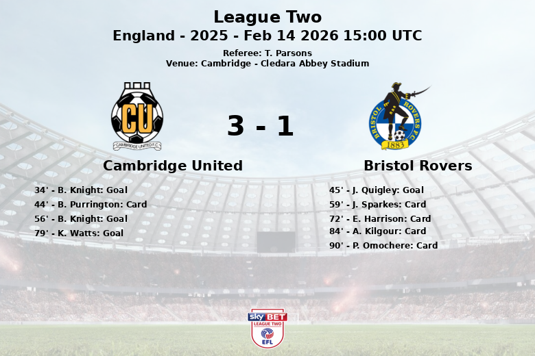 Cambridge, Inglaterra – Em um confronto disputado no Cledara Abbey Stadium, o Cambridge United saiu vitorioso contra o Bristol Rovers em uma partida que manteve os torcedores à beira de seus assentos. O jogo, correspondente à 32ª rodada da League Two, terminou com um placar favorável ao time da casa.