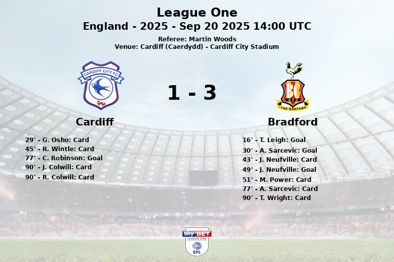 O segundo tempo começou com um gol rápido de J. Neufville aos 49 minutos, assistido por W. Swan, que parecia selar o jogo. O Cardiff tentou uma remontada desesperada, conseguindo diminuir o placar aos 77 minutos com um gol de C. Robinson. No entanto, a defesa do Bradford permaneceu sólida e frustrou as tentativas dos donos da casa de empatar. A partida terminou com um Bradford bem organizado que soube aproveitar suas oportunidades, apesar de ter menos posse de bola (40%) e cometer 10 faltas em comparação com as 11 do Cardiff. O placar final refletiu um resultado de 3 a 1 que, sem dúvida, ressoará no moral do time galês. O árbitro Martin Woods mostrou um total de nove cartões amarelos durante a partida, seis para o Cardiff e três para o Bradford, destacando a intensidade do jogo.