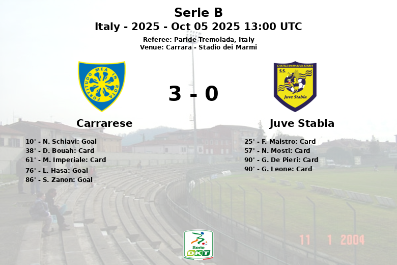 N. Schiavi abriu o placar para o Carrarese aos 10 minutos, após um pênalti. Apesar do domínio na posse de bola do Juve Stabia, que tentou gerar perigo com 14 remates (2 à baliza), o Carrarese mostrou-se sólido na defesa e aproveitou as suas oportunidades. A segunda parte viu L. Hasa ampliar a vantagem aos 76 minutos, com assistência de M. Finotto, e S. Zanon selou a vitória aos 86 minutos, assistido pelo mesmo L. Hasa.