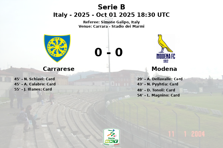 Carrara, Itália – Em um confronto disputado no Stadio dei Marmi, Carrarese e Modena empataram em 0 a 0 em uma partida da Serie B correspondente à sexta rodada. O encontro, arbitrado por Simone Galipo, foi caracterizado pela intensidade e pelas batalhas no meio-campo, mais do que pelo brilho ofensivo.