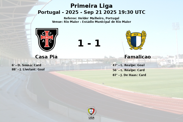 Rio Maior, Portugal – Num encontro renhido e com alternativas para ambas as equipas, Casa Pia e Famalicão empataram no Estádio Municipal de Rio Maior. O jogo, válido pela sexta jornada da Primeira Liga, viu o Famalicão adiantar-se no marcador aos 47 minutos com um golo de L. Realpe, após assistência de Gil Dias.