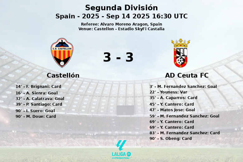 Uma partida vibrante e carregada de emoções foi vivida no Estádio SkyFi Castalia, onde o Castellón e o AD Ceuta FC empataram em um encontro disputado até o último minuto. O Ceuta golpeou primeiro aos 3 minutos com um gol de M. Fernandez Sanchez, mas o Castellón respondeu rapidamente com gols de A. Sienra aos 16 minutos e A. Calatrava aos 32. O Ceuta havia encontrado o empate aos 22 minutos com gol de Youness, mas foi anulado por impedimento. O Ceuta voltou à carga e Matos Jose igualou o marcador aos 47 minutos. M. Fernandez Sanchez voltou a colocar o Ceuta na frente aos 59 minutos. A expulsão de Y. Cantero aos 69 minutos complicou as coisas para o Ceuta, que apesar disso conseguiu manter a vantagem até o tempo de desconto. Um pênalti convertido por I. Suero aos 90 minutos selou o empate final.