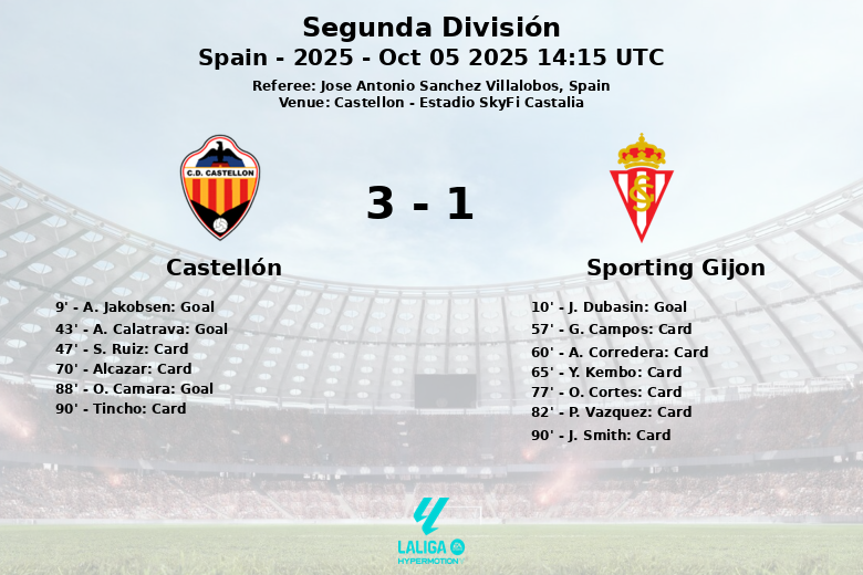 O Castellón triunfou em casa contra o Sporting Gijón em uma partida cheia de emoção e reviravoltas. O jogo, disputado no Estádio SkyFi Castalia, terminou com um placar favorável ao time da casa, que dominou a posse de bola com 63%.