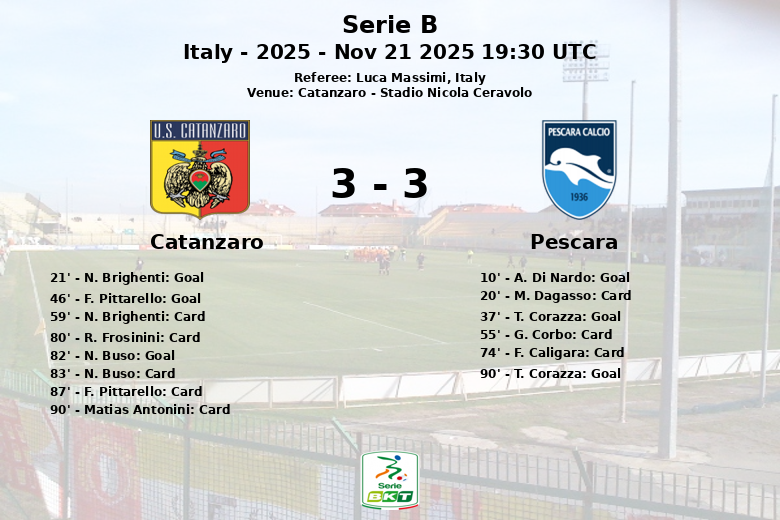 Um jogo vibrante e cheio de gols aconteceu no Stadio Nicola Ceravolo, onde Catanzaro e Pescara empataram em um confronto da Serie B. O Pescara abriu o placar cedo com um gol de A. Di Nardo aos 10 minutos, assistido por R. Tonin. O Catanzaro respondeu rapidamente aos 21 minutos com um gol de N. Brighenti, assistido por A. Cisse. Antes do intervalo, T. Corazza colocou o Pescara à frente novamente aos 37 minutos.