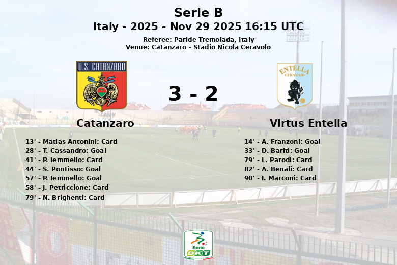 A partida começou com intensidade, refletida em um cartão amarelo logo no início para Matias Antonini do Catanzaro, aos 13 minutos. Apenas um minuto depois, o Virtus Entella abriu o placar com um gol de pênalti de A. Franzoni. No entanto, o Catanzaro reagiu fortemente. T. Cassandro empatou o jogo aos 28 minutos, com assistência de S. Pontisso. A alegria durou pouco, já que D. Bariti do Virtus Entella colocou sua equipe à frente novamente aos 33 minutos. Pouco antes do intervalo, S. Pontisso marcou de pênalti aos 44 minutos, igualando o placar mais uma vez.