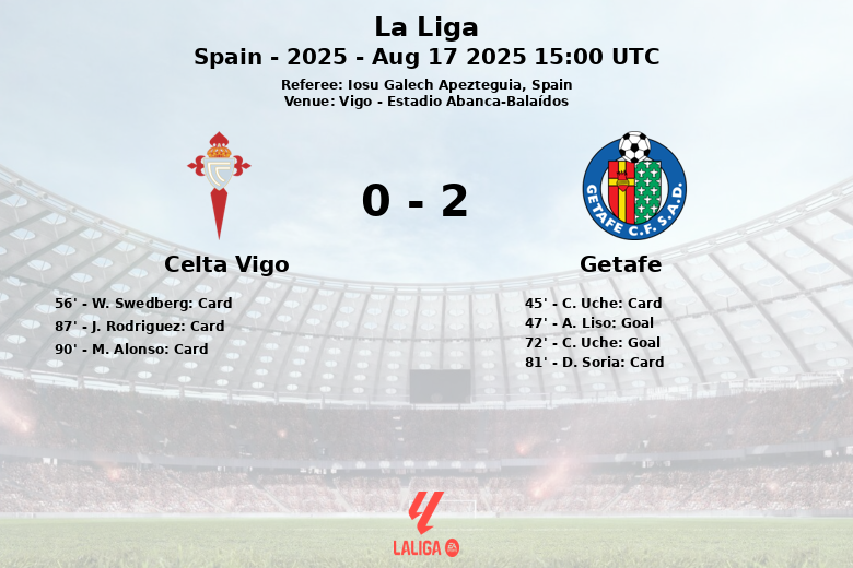 Aos 72 minutos, C. Uche redimiu-se do seu cartão amarelo e ampliou a vantagem do Getafe, desta vez com uma assistência de I. Bekhoucha. Apesar dos esforços do Celta para reagir, incluindo várias mudanças em sua escalação a partir dos 57 minutos, a defesa do Getafe permaneceu sólida.