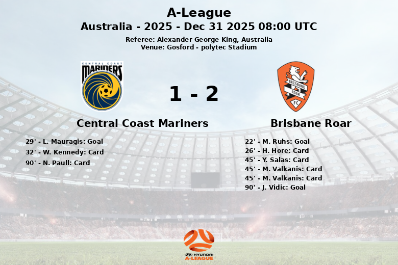 Brisbane Roar abriu o placar aos 22 minutos graças a um gol de M. Ruhs, assistido por C. Long. No entanto, a alegria não durou muito, já que L. Mauragis empatou para o Central Coast Mariners aos 29 minutos, com assistência de A. McCalmont. A partida permaneceu equilibrada, com ambas as equipes buscando impor seu jogo.