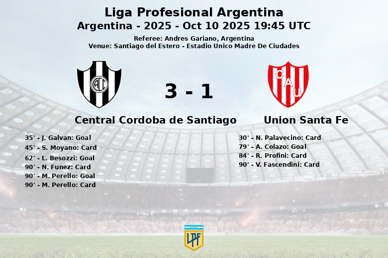 Santiago del Estero testemunhou um jogo vibrante da Liga Profesional Argentina, onde o Central Córdoba de Santiago derrotou o Unión de Santa Fe no Estádio Único Madre de Ciudades. A partida, arbitrada por Andrés Gariano, manteve os torcedores à beira de seus assentos desde o apito inicial até o final.