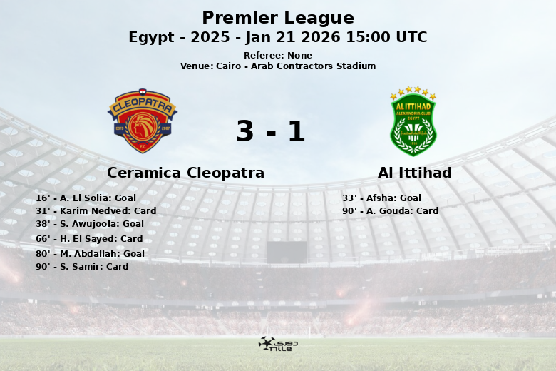 Cairo, Egito – Em uma partida vibrante realizada no Arab Contractors Stadium, o Ceramica Cleopatra triunfou sobre o Al Ittihad em um jogo correspondente à 15ª rodada da Premier League Egípcia. A partida, que ocorreu em 21 de janeiro de 2026, foi caracterizada por um jogo disputado e cheio de alternativas.