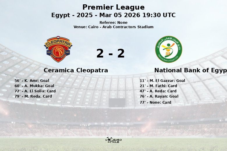 O Arab Contractors Stadium, no Cairo, foi palco de um vibrante confronto da Premier League egípcia, onde o National Bank of Egypt e o Ceramica Cleopatra empataram em um jogo repleto de emoções. O National Bank of Egypt abriu o placar aos 11 minutos com um gol de M. El Gazzar, assistido por M. Shalaby. A partida se intensificou, levando M. Fathi e A. Reda do National Bank a receberem cartões amarelos aos 21 e 47 minutos, respectivamente. O Ceramica Cleopatra respondeu no segundo tempo, com K. Amr empatando aos 56 minutos. Pouco depois, A. Mukka colocou o Ceramica Cleopatra na frente aos 60 minutos. No entanto, o National Bank of Egypt não se rendeu e A. Rayan igualou a partida aos 76 minutos. O encontro foi disputado, com vários cartões amarelos mostrados para ambas as equipes, incluindo A. El Solia e M. Reda do Ceramica Cleopatra, bem como um cartão para um jogador não identificado do National Bank of Egypt aos 77 minutos. Em termos de posse de bola, o Ceramica Cleopatra dominou com 58% em comparação com 42% do National Bank of Egypt. Ambas as equipes realizaram 10 chutes, mas o National Bank of Egypt teve mais chutes a gol (5) do que o Ceramica Cleopatra (2).