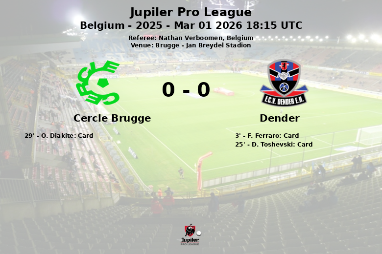 Le jeu a été interrompu à plusieurs reprises par des fautes, avec 10 commises par chaque équipe. En ce qui concerne les cartons, Dender a reçu deux cartons jaunes (F. Ferraro à la 3e minute et D. Toshevski à la 25e minute), tandis que le Cercle Brugge a vu un carton jaune attribué à O. Diakite à la 29e minute. Le Cercle Brugge a également obtenu un avantage en termes de corners, avec 9 en sa faveur contre 4 pour Dender. La rencontre s’est déroulée à Bruges, au Jan Breydel Stadion le 1er mars 2026.
