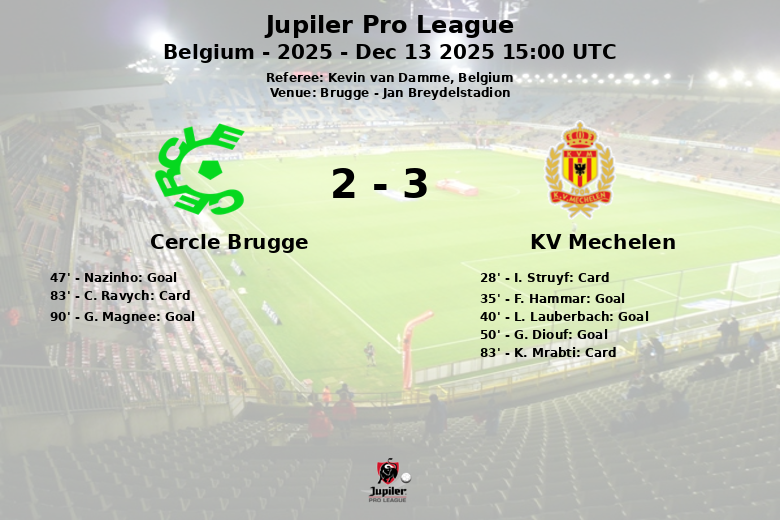 Brugge, Bélgica – Em um jogo emocionante realizado no Jan Breydelstadion, o KV Mechelen triunfou sobre o Cercle Brugge em uma partida correspondente à 18ª rodada da Jupiler Pro League. O árbitro Kevin van Damme testemunhou um duelo que manteve os torcedores à beira de seus assentos até o último minuto.