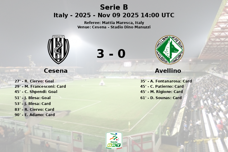 O Cesena garantiu uma vitória imponente contra o Avellino no Stadio Dino Manuzzi, em uma partida caracterizada por alta intensidade e inúmeros cartões amarelos. A equipe da casa capitalizou sua eficiência em frente ao gol e uma defesa sólida para conquistar a vitória.