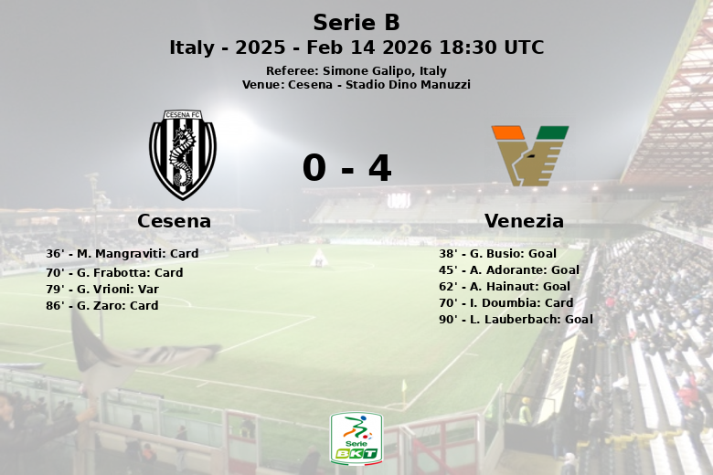 O Venezia controlou o jogo desde o início, mantendo 67% da posse de bola. G. Busio abriu o placar aos 38 minutos com um gol, seguido por A. Adorante pouco antes do intervalo, aos 45 minutos. O Cesena lutou para conter o ataque do Venezia, que gerou inúmeras oportunidades de gol.