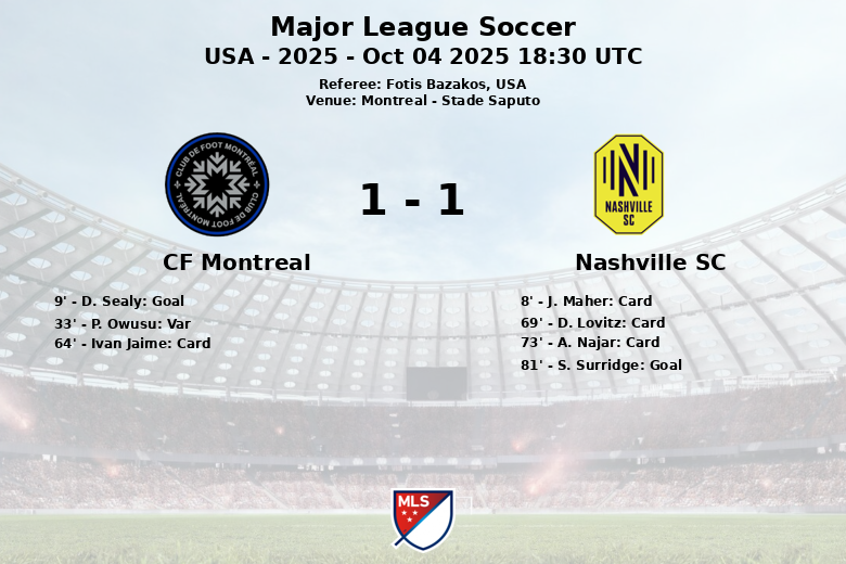 Montreal, 4 de outubro de 2025 – O Stade Saputo testemunhou um empate emocionante entre o CF Montreal e o Nashville SC em uma partida da temporada regular da Major League Soccer. A partida, apitada pelo árbitro Fotis Bazakos, terminou com um placar que refletiu a intensidade e o esforço de ambas as equipes.