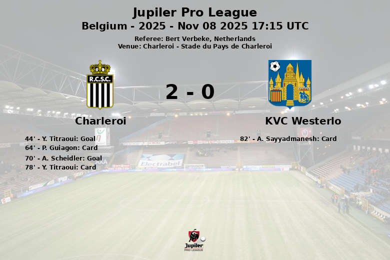 O árbitro, Bert Verbeke, distribuiu cartões amarelos para P. Guiagon e Y. Titraoui do Charleroi, e para A. Sayyadmanesh do KVC Westerlo. A partida, disputada em 8 de novembro de 2025, deixou o Charleroi como o vencedor em casa.
