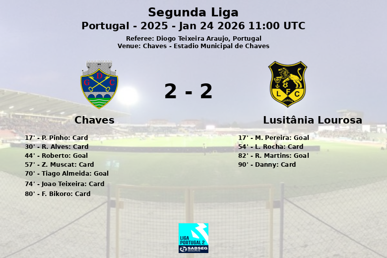 Chaves, Portugal – Um jogo cheio de ação e emoções aconteceu no Estádio Municipal de Chaves, onde o Chaves e o Lusitânia Lourosa empataram num vibrante encontro da Segunda Liga. O Lusitânia Lourosa surpreendeu no início, abrindo o placar aos 17 minutos com um gol de M. Pereira, assistido por Arsenio. No entanto, o Chaves reagiu antes do intervalo, igualando o marcador aos 44 minutos graças a Roberto, com assistência de D. Kusso.