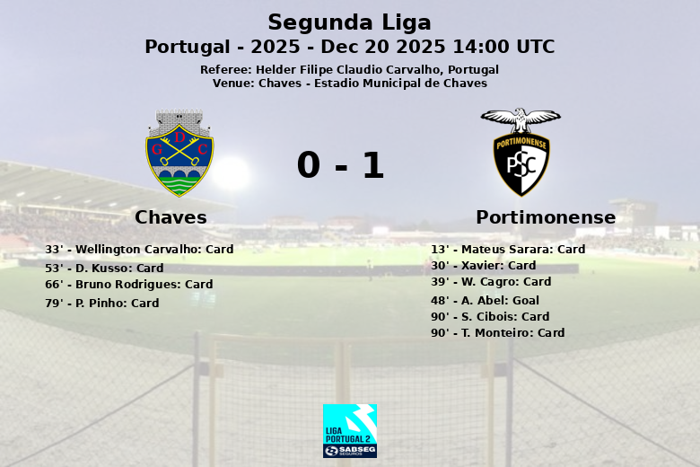 O único gol da partida surgiu aos 48 minutos, marcado por A. Abel para o Portimonense. O segundo tempo continuou no mesmo ritmo, com o Chaves buscando o empate e o Portimonense defendendo sua vantagem. A pressão resultou em mais cartões amarelos para ambas as equipes, com D. Kusso, Bruno Rodrigues e P. Pinho do Chaves, e S. Cibois e T. Monteiro do Portimonense, todos sendo advertidos.