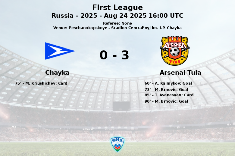 Em um encontro correspondente à sexta rodada da First League russa, o Arsenal Tula conquistou a vitória sobre o Chayka no Stadion Central’nyj im. I.P. Chayka em Peschanokopskoye. A partida, disputada em 24 de agosto de 2025, viu o Arsenal Tula aproveitar suas oportunidades para assumir a liderança no placar.