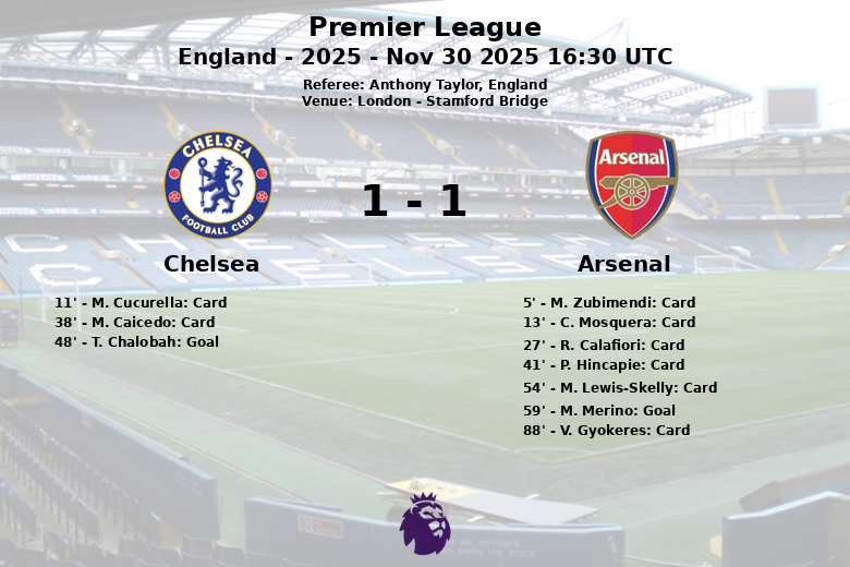 Londres, Inglaterra – Uma partida disputada entre Chelsea e Arsenal em Stamford Bridge terminou em um empate, deixando os torcedores na ponta dos assentos. O encontro, correspondente à 13ª rodada da Premier League, foi marcado pela intensidade e polêmica, com um total de sete cartões amarelos e um cartão vermelho mostrados pelo árbitro Anthony Taylor.