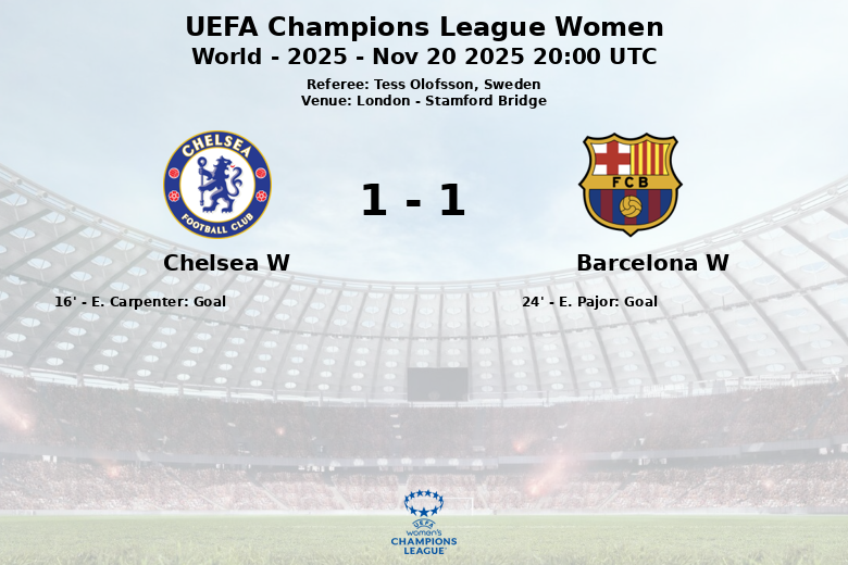 Londres, 20 de novembro de 2025 – Em uma partida da UEFA Champions League Feminina, Chelsea e Barcelona empataram em um confronto disputado em Stamford Bridge. O Chelsea abriu o placar aos 16 minutos com um gol de E. Carpenter, assistida por A. Beever-Jones. No entanto, o Barcelona igualou a partida aos 24 minutos com um gol de E. Pajor.