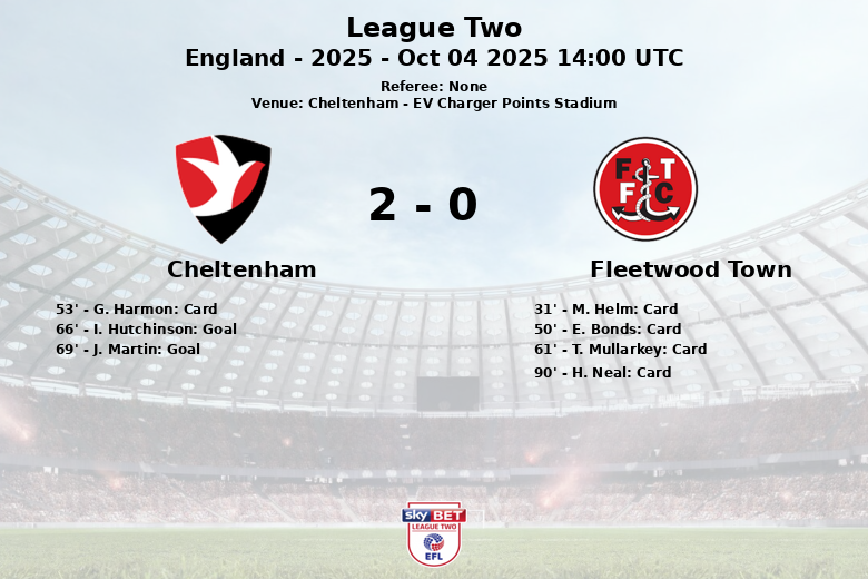 Cheltenham, Inglaterra – Em uma partida realizada no EV Charger Points Stadium, o Cheltenham saiu vitorioso contra o Fleetwood Town com um placar de 2-0. Apesar do Fleetwood Town dominar a posse de bola com 54% em comparação com os 46% do Cheltenham, eles não conseguiram capitalizar sua superioridade em campo.
