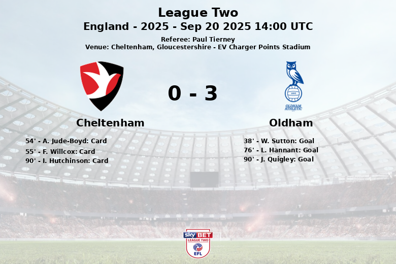 Cheltenham, Gloucestershire – Em uma partida realizada no EV Charger Points Stadium, o Oldham Athletic triunfou sobre o Cheltenham Town com um placar final de 3 a 0. O jogo, arbitrado por Paul Tierney, fez parte da nona rodada da temporada regular da League Two.