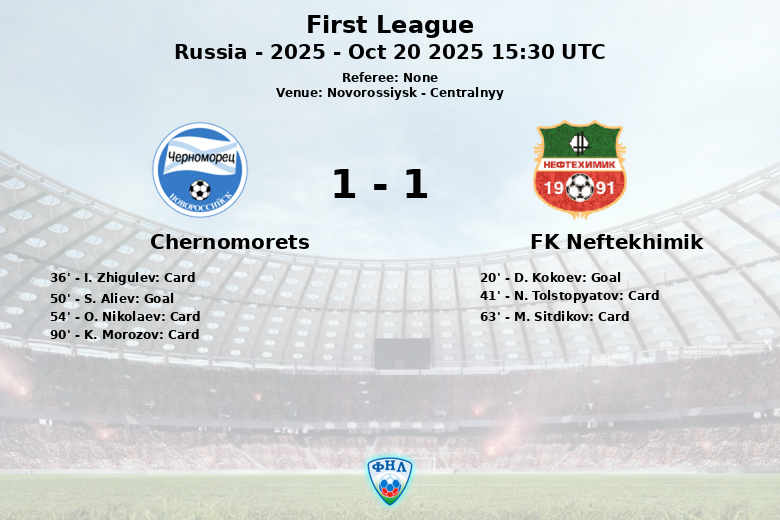 Novorossiysk, Rússia – Um encontro renhido no Centralnyy Stadium viu o Chernomorets e o FK Neftekhimik empatarem em uma partida correspondente à 15ª rodada da First League. O encontro, parte da temporada 2025 na fase Regular Season, se desenvolveu com intensidade desde o começo.