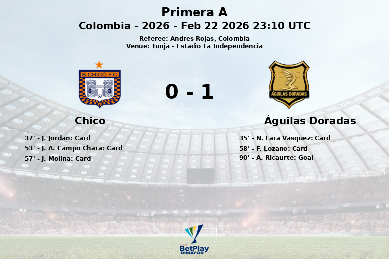 Tunja, Colômbia – Em uma partida disputada no Estádio La Independencia, o Águilas Doradas conquistou uma vitória sofrida por 1 a 0 sobre o Chico, na oitava rodada da Primera A. O jogo, marcado por um alto número de faltas e cartões amarelos, foi decidido aos 90 minutos com um gol de Andrés Ricaurte, assistência de C. Canozales.