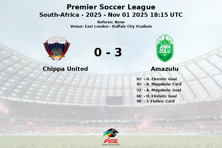 O placar foi aberto aos 42 minutos com um gol de H. Ekstein, que não precisou de assistência para inaugurar o marcador. Já na segunda etapa, A. Maqokola ampliou a vantagem aos 53 minutos. O próprio H. Ekstein selou seu doblete e virtualmente a vitória para o Amazulu aos 66 minutos, convertendo um pênalti com facilidade. A partida também teve momentos de tensão, com um cartão amarelo para A. Maqokola aos 45 minutos e outro para T. Fielies nos acréscimos. Apesar do esforço, o Chippa United não conseguiu gerar oportunidades claras de gol ou incomodar o goleiro adversário, evidenciando uma clara superioridade da equipe visitante.