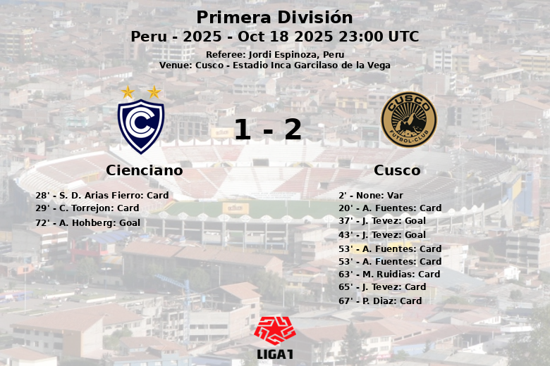 Substituiões na equipe de cienciano: Aos 70 minutos, C. Souza Espana entrou e L. E. Benites Vargas saiu., Aos 71 minutos, L. Galeano entrou e C. Neira saiu., Aos 83 minutos, B. Da Silva entrou e R. Sandoval saiu., Aos 83 minutos, C. Torrejon entrou e O. Noronha saiu., Aos 83 minutos, A. Gonzalez entrou e A. Ramua saiu.