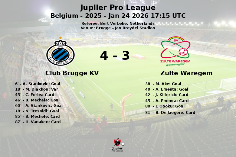 O Brugge abriu o placar logo no início, aos 6 minutos, com um gol de A. Stankovic assistido por J. Seys. No entanto, a alegria durou pouco, já que um gol de M. Diakhon foi anulado por impedimento aos 18 minutos. O Zulte Waregem reagiu com força, virando o placar com gols de M. Ake (38′) e A. Ementa (40′), este último assistido por L. Willen. O Brugge respondeu antes do intervalo com um gol de B. Mechele aos 46 minutos.