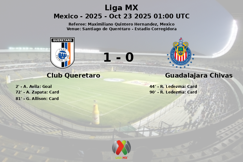 A partida foi caracterizada por um jogo disputado, com vários cartões mostrados. R. Ledezma, do Chivas, recebeu um cartão amarelo aos 44 minutos e posteriormente foi expulso com cartão vermelho aos 90 minutos. Pelo lado do Querétaro, A. Zapata e G. Allison também foram advertidos. A partida culminou em um resultado que reflete a eficácia do Querétaro frente à esterilidade ofensiva do Chivas, apesar do seu domínio territorial e número de escanteios (11 a 0).