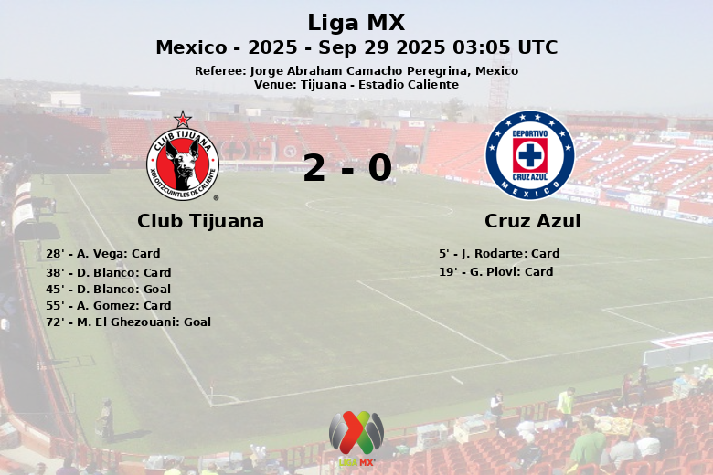 Tijuana, México – Em uma partida disputada no Estádio Caliente, o Club Tijuana derrotou o Cruz Azul com autoridade por 2 a 0 na 11ª rodada do Apertura 2025 da Liga MX. A partida foi marcada por alta intensidade, refletida nos numerosos cartões mostrados e na expulsão precoce de um jogador do Cruz Azul.