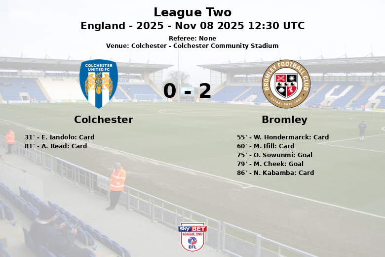 O primeiro tempo terminou sem gols, mas com um cartão amarelo para E. Iandolo do Colchester. O segundo tempo foi muito mais agitado. W. Hondermarck e M. Ifill do Bromley receberam cartões amarelos antes de O. Sowunmi abrir o placar para os visitantes aos 75 minutos, com assistência de M. Pinnock. Pouco depois, M. Cheek ampliou a vantagem do Bromley aos 79 minutos. O Colchester tentou responder, mas a defesa do Bromley permaneceu sólida. A. Read do Colchester recebeu um cartão amarelo aos 81 minutos, e N. Kabamba do Bromley também foi advertido perto do final. Apesar de ter significativamente mais escanteios (7 contra 2) e maior posse de bola, o Colchester não conseguiu capitalizar seu domínio, e o Bromley levou todos os três pontos. O Bromley cometeu um total de 13 faltas durante a partida, demonstrando um jogo físico e disputado.