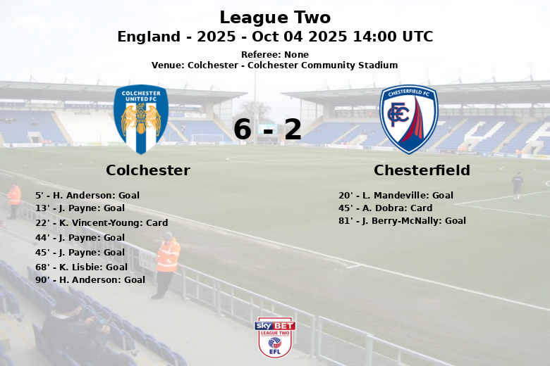 H. Anderson abriu o placar para o Colchester aos 5 minutos, assistido por K. Lisbie, marcando o início de uma tarde prolífica. J. Payne ampliou a vantagem aos 13 minutos. O Chesterfield respondeu aos 20 minutos com um gol de L. Mandeville, com assistência de D. Tanton. No entanto, J. Payne reapareceu aos 44 minutos, novamente com assistência de K. Lisbie, e então converteu um pênalti pouco antes do intervalo, aos 45 minutos, colocando o placar em 4 a 1.