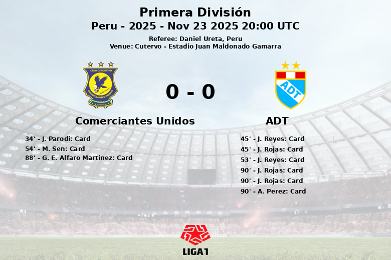 A partida foi continuamente interrompida por faltas, com o Comerciantes Unidos cometendo 15 e o ADT cometendo 11. A disciplina foi um fator chave, com um total de seis cartões amarelos e três cartões vermelhos mostrados pelo árbitro Daniel Ureta. O ADT sofreu a expulsão de um jogador aos 53 minutos e, perto do final, viu outro jogador ser expulso, assim como um jogador do Comerciantes Unidos aos 88 minutos. A partida, disputada no Estádio Juan Maldonado Gamarra, deixa um gosto amargo para ambas as equipes, que buscavam somar pontos valiosos na tabela.